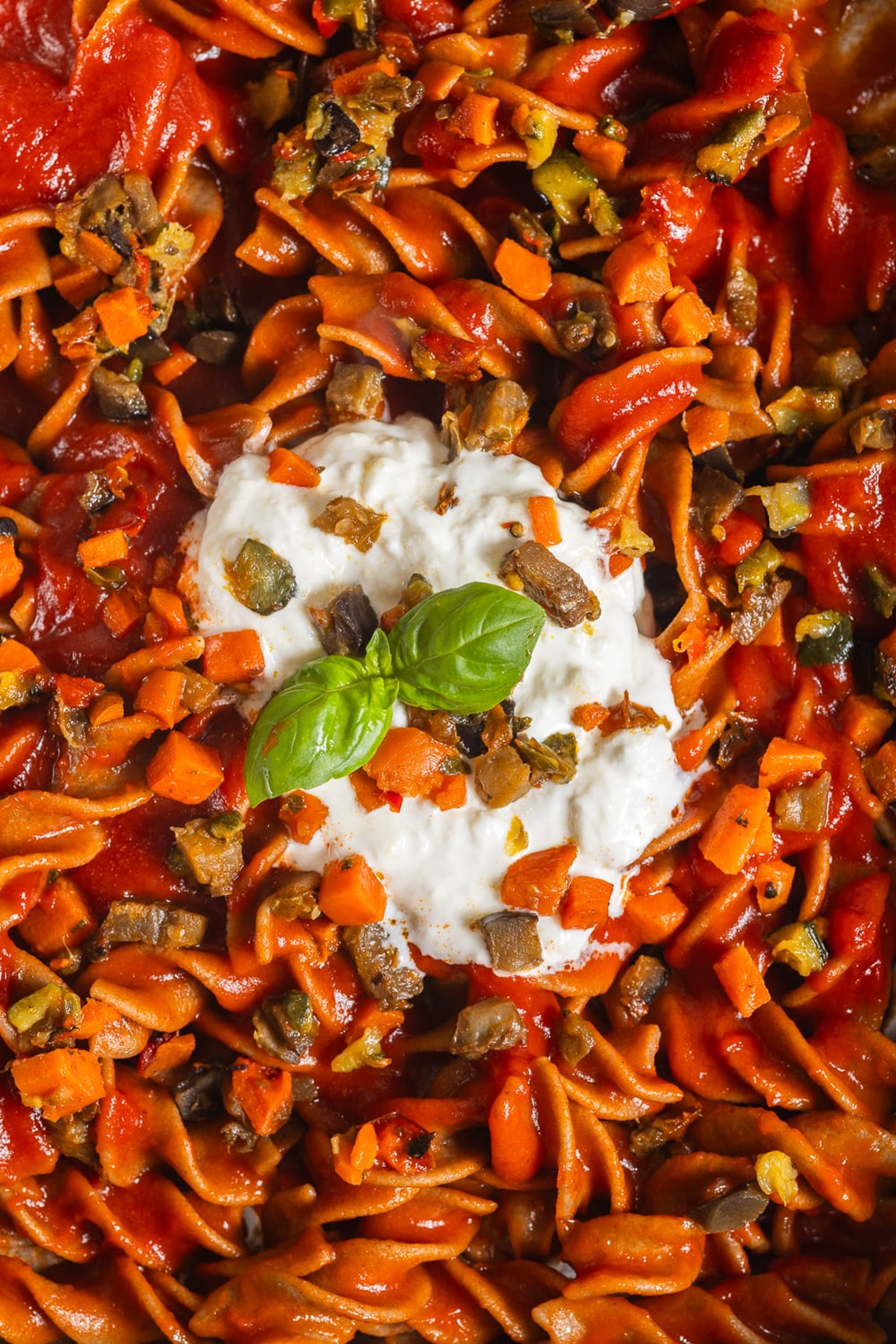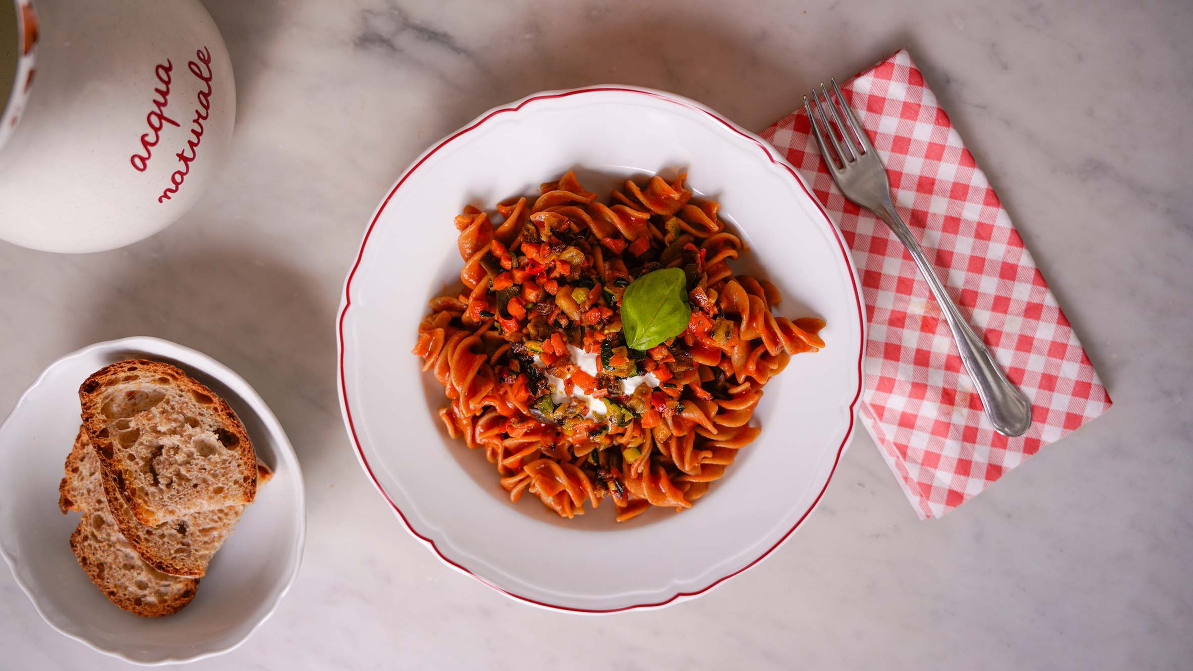 Si sa, il nostro fusillone di sorgo raccoglie il sugo come nessun altro formato di pasta. Così, con salsa di pomodoro, stracciatella pugliese e un mix di verdure spadellate, anche il piatto più leggero diventa godurioso.